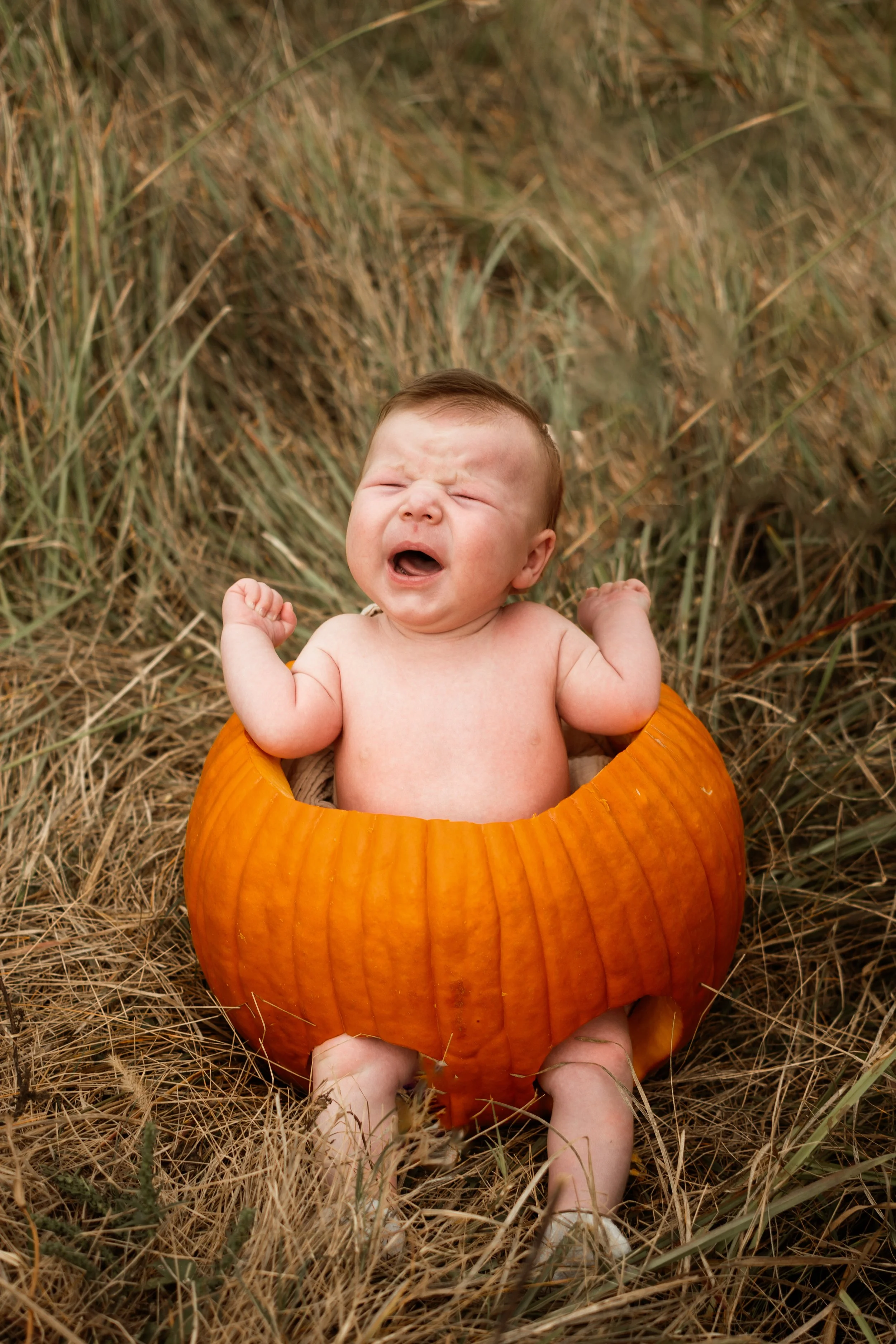 Then it was Wes' turn... let's just say we underestimated how much that little man had grown! He could barely squeeze into his pumpkin! We ended up putting him in Jacob's, but he was NOT having it.